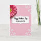 This card features a soft, muted pink background that sets a gentle, affectionate mood ❤️. In the center, a white rounded frame with a dashed outline holds the main greeting, with “Happy Mother’s Day” in flowing cursive-style lettering above “DEAR DAUGHTER” in a neat, simple typeface. The text appears in dark gray or near-black, standing out clearly against the pale interior while keeping the look calm and tender. A large flower blooms at the upper left, its rich fuchsia petals opening outward like a warm embrace, adding a romantic touch through its inviting shape. At the flower’s center, golden-yellow texture fades into fresh green, giving the design a lively, garden-like feel 🌼. Fine white lace-like patterns decorate the upper-right and lower-right corners, like delicate trim that frames the message without crowding it. The overall palette balances pink, fuchsia, white, yellow, and green, with the floral accent drawing the eye diagonally toward the framed words. The dashed border around the central frame looks like tiny stitched marks, and the corner filigree curls into small loops and leaf-like shapes.