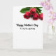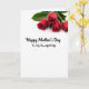 This greeting card features four deep red blossoms near the top, each partly closed with layered petals that look soft and tender, like a quiet sign of closeness ❤️. Small green leaf sprigs sit alongside the flowers, adding a cool contrast against the wide white background. The large open space feels airy and calm, letting the flowers stand out the way two close friends might lean toward each other without needing much else around. Below the floral cluster, a flowing line of text is centered and set in a dark gray tone for easy reading. The wording addresses a loved partner for a special day, and its placement leaves generous breathing room above and around it. Gentle, diffused lighting highlights the petal edges and the slight texture in the leaves, keeping everything soft and romantic 🌼. The flowers sit at the upper edge of the card, while the dark gray message rests beneath them on the bright white field.