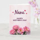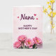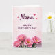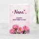 This greeting card features a soft pale pink background with gentle, cloud-like blush shading that sets a calm, affectionate tone ❤️. Near the top, the word “Nana” appears in rich magenta lettering with smooth, flowing strokes, like a loving nickname written with care. Three small pink hearts float close by, adding a sweet, close-knit touch without crowding the space. Centered beneath that, the message “HAPPY MOTHER’S DAY” is set in uppercase letters in the same magenta color, arranged in a neat, easy-to-read line. The layout feels airy and balanced, letting the words and decorations breathe while keeping everything aligned down the middle. Along the bottom edge, four large, stylized pink blossoms spread outward like a bouquet gathered for someone special 🌼. Each flower has layered petals in soft-to-deeper pink tones, and each center glows in yellow-orange against the pale pink background.
