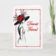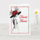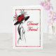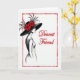 Designed with a classic fashion-illustration look, this card uses black, white, and deep crimson to create a romantic, friendly mood ❤️. A stylish woman is shown in profile at the center-left, her eyes turned to the right as if she’s sharing a quiet, tender moment with someone just out of view. She wears a wide-brim hat crowned with rich red flowers and airy, feather-like accents that sweep upward and add drama to her silhouette. Her dress is lightly drawn in dark lines, while a small crimson touch on her lips echoes the floral details for a soft, affectionate feel. To the right of her face, the words “Dearest Friend” appear in flowing cursive lettering in red, placed mid-height so it feels like it’s part of her gaze. The limited palette keeps the scene simple, with the red accents guiding your eye between the hat, the lips, and the message 🌼. A loose, organic red border frames the entire design with sketchy strokes that look like a hand-drawn outline. The background stays white and open, making the crimson frame and blossoms stand out sharply against the black-and-white figure.