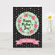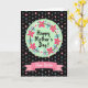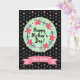 This card features a pastel green circular frame centered on a deep charcoal background, drawing your eye straight to the middle. Inside the circle, a flowing message in dark ink sits neatly in the center, surrounded by a ring of flowers that feels like a gentle hug ❤️. Fuchsia blooms with soft, layered petals mingle with white daisy-like flowers, and their yellow centers add a sunny, friendly glow 🌼. Soft blue leaves and tiny accent buds weave through the wreath, giving the arrangement a cozy, close-together look like friends leaning in for a photo. Below the circle, a pale pink ribbon banner stretches across the card with a name or short address printed in a simple, readable style. The banner text appears in a darker tone for contrast and sits centered on the ribbon. In the background, small diamond shapes in muted rose, pale aqua, and cool gray are scattered evenly, creating a subtle pattern behind the main design.