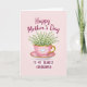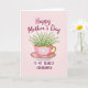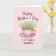 This design shows a glossy pink teacup with a thin gold rim and a gently curved handle, centered like a small gift ❤️. A small white raised heart sits on the cup, adding a quiet romantic touch as if it’s meant for someone close. From the cup spills a full bouquet of tiny bell-shaped white flowers with fresh green stems and leaves, leaning together in a tender, shared cluster. The cup rests on a matching pink saucer edged in gold, set against a soft blush background that fades subtly from lighter to slightly deeper pink. Near the top, a short greeting appears in deep magenta lettering, and a smaller line of text sits near the bottom in the same color, balanced around the central image 🌼. Gentle lighting highlights the smooth shine of the cup and the soft texture of each petal without harsh shadows. The gold trim catches the light along the rim and saucer edge, framing the flowers against the rosy gradient backdrop.