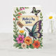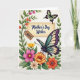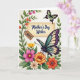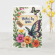 On the front of the card a cream-colored rectangular panel sits near the center, edged by a thin frame and carrying a flowing dark message across the middle. A small tag hangs off the panel like a gift label, with a short line in a lighter tone that reads like it’s meant for one special person ❤️. Around the panel, flowers and curling greenery fill the space, with blossoms in pink, orange, and yellow tucked among leafy stems that lean up the left side like a gentle arch. In the lower right, a large winged insect rests with wings patterned in purple, teal, and soft cream, angled as if it has paused to admire the note. Near the upper right, a smaller winged creature flutters by, colored lime green with warm orange touches, adding a light, friendly energy 🌼. The soft lighting feels like a calm spring afternoon, and the plants seem to cradle the central message the way close friends might gather around a shared moment. Pink and golden blooms cluster along the left margin, with tiny buds and winding tendrils reaching upward beside the framed panel.
