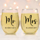 Elegant personalized keepsake wine glass set for the bride and groom to celebrate with at their rehearsal dinner, wedding reception and other events featuring "Mr" and "Mrs" in a large chic script and your new family name in classic serif typography.