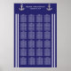 Customize this elegant Nautical Wedding Navy Stripes Seat Chart poster design. Navy Blue and white striped pattern design with two navy ship anchors at the top and a blue and white rope border. A template for an easy customization of your wedding details such as names of bride and groom as well as the date of wedding.Same design is available in other matching wedding stationary supplies to carry the nautical wedding theme in style. Delete tables data, if you require chart with lesser number of tables.