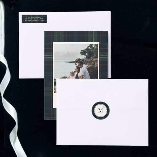 Modern Christmas doormat featuring a timeless design with your monogram over a muted navy blue and green plaid background.