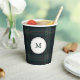 Modern Christmas paper cups featuring a timeless design with your monogram over a muted navy blue and green plaid background.