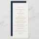 This elegant wedding menu features a chic modern design. The front is a cream with a modern gold typography, while the reverse side is a dark navy blue with your initials in a gold typography. Personalize with your names, wedding date and your menu.