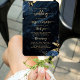 This elegant wedding program fan features navy blue floral bouquets set off with gold faux foil greenery in two corners, on a background image of navy blue watercolor agate. The customizable text combines gold-colored serif and handwriting fonts. The reverse side provides space for the wedding party on a matching navy blue background.