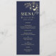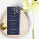 Sophisticated and modern wedding menu card in rich navy blue, adorned with delicate gold floral accents. This elegant piece beautifully showcases your dinner selections, adding a refined touch to each place setting. Perfect for spring, fall, or formal weddings.