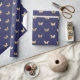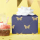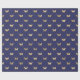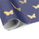 This wrapping paper features elegant faux gold foil butterfly pattern on navy blue background.