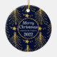 Elegant Navy Blue Gold Christmas Ornament. This circle ceramic ornament design features cute gold Christmas tree star pattern on blue background. You can customize the text, size and color. Personalize it with your family name. For further customization, feel free to contact me at kbasandra@gmail.com.