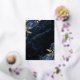 This elegant wedding invitation features blue floral bouquets set off with gold faux foil greenery in two corners, on a background image of navy blue watercolor agate. The customizable text combines real gold foil serif, italic and handwriting fonts. The reverse side features a matching navy blue and gold floral and agate design.