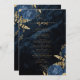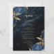 This elegant wedding menu features blue floral bouquets set off with gold faux foil greenery in two corners, on a background image of navy blue watercolor agate. The customizable text combines gold-colored serif and handwriting fonts. The reverse side features a matching navy blue and gold floral and agate design.
