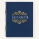 An elegant navy blue and gold notebook for your office or back to school. Add your name between the gold floral flourish on the front and an initial on the back. Designed for you by Blackberry Boulevard.
