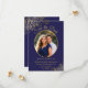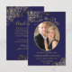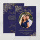 These beautiful cards are a great way to let your friends and family know to save the date for your upcoming wedding. They feature a navy blue and gold design with your photo in an oval shaped frame surrounded by ornate golden faux foil curls and swirls and fancy script lettering with your names, wedding date and location. The back has a cute "pencil us in" graphic with space for a note that can include a website where your guests can go for more information.