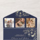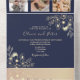 This elegant all-in-one navy blue wedding invitation features delicate gold floral illustrations, a romantic photo collage, and a modern QR code for easy RSVPs. Perfect for couples who want a sophisticated, tech-savvy, and beautiful way to announce their special day. Customize your names, date, and website with ease for a seamless guest experience.