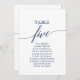 These elegant navy blue table number 5 seating chart cards are perfect for a simple wedding. The neutral design features a minimalist card decorated with romantic and whimsical typography. The card prints on the front and back (double-sided).