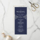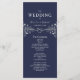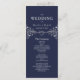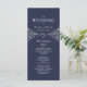 Elegant modern minimalist chic simple calligraphy navy blue wedding program with romantic silver rope heart and gilded floral lace.