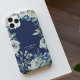 Bold navy blue and white peony floral monogram iPhone 14 case for a modern woman who loves beautiful watercolor flowers. An elegant botanical spray of green leaves unfolds around your name.
