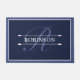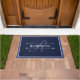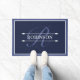 Elegant minimalist doormat printed with your initial in a pretty script with your family name written across between two dividers with arrow points in white and navy blue.