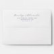 This wedding envelope features a clean, elegant design with a simple layout centered on a white background. The names are highlighted in an ornate script font, while the address is presented in a crisp sans-serif typeface, creating a sophisticated and modern look. The deep navy blue text contrasts beautifully against the white, ensuring readability and a classic appearance. With ample negative space and a formal alignment, this envelope exudes simplicity and formality, perfect for special occasions like weddings or formal announcements.