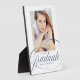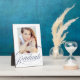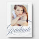 Celebrate your graduate's achievement with a custom graduation photo keepsake. The photo plaque features the graduate's photo with "graduate" displayed in an elegant navy calligraphy script. Personalize the modern graduation photo plaque by adding the graduate's name, school, and graduation year.