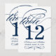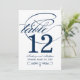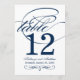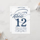Sweeping calligraphy script in navy blue creates a dramatic and sophisticated wedding table number card. The flowing letterforms and delicate flourishes bring timeless elegance to your reception seating. The couple's names, wedding date, and table number are easy to personalize. Each table number must be individually personalized and added to the cart one at a time.