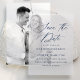 Set the tone for your wedding with our elegant vellum save the date cards. This design features "Save the Date" in sophisticated navy calligraphy on a sheer vellum background, combining timeless beauty with a modern touch. Couples can personalize the card with their names, wedding date, location, and wedding website in bold navy lettering, ensuring your details are stylish and easy to read. Perfect for creating a lasting impression, these customizable vellum cards offer a refined and contemporary way to announce your special day to family and friends.