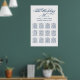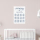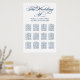 Elegant calligraphy script wedding seating chart poster design features a monogram of the bride and groom names and wedding date and custom template text for twelve (12) table numbers with guest names. Navy blue and white color scheme can be modified to coordinate with your wedding colors.