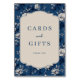 This elegant wedding tabletop sign features a sophisticated navy blue background adorned with a repeating pattern of detailed white roses and green foliage, creating a classic and timeless look. The central frame is a creamy off-white color, providing a clean backdrop for the bold serif typography that reads "Cards and Gifts" followed by "Thank You," conveying gratitude in a refined manner. The balanced layout and harmonious design make it perfect for expressing appreciation at your special event.