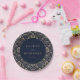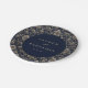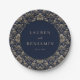 This elegant wedding plate features a sophisticated navy blue background adorned with intricate, repeating floral patterns in a luxurious damask style. The central circular design showcases customizable text in a classic serif font, framed by a thin double border for a polished look. The overall aesthetic is timeless and refined, perfect for celebrating your special day with an air of sophistication and natural elegance. Ideal for formal occasions, this design combines traditional motifs with modern clarity to create a memorable table setting.