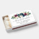 A rich and moody wedding matchbox favor showcasing "The Perfect Match" in elegant script surrounded by a dramatic watercolor arrangement of deep burgundy, navy, and plum florals. The couple's names and date sit below in a refined layout on a soft white background. This bold floral design brings a luxurious, jewel-toned depth to your reception. Customize the names and date for a stunning favor. All text is fully editable.