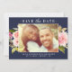 Classic and polished, this save the date features blush peony and dahlia floral corners framing a couple photo on a deep navy background, with refined mixed typography and a soft pink stripe card reverse. The navy and blush pairing is a timeless favorite for formal, coastal, or garden weddings. All text is fully customizable.