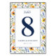 This elegant wedding table card features a symmetrical layout with a floral border in soft pastel hues of light orange, lavender, pale yellow, and muted blue. The central white rectangle highlights the bold navy number "8" surrounded by delicate daisies and poppies, creating a natural and organic feel. The design combines cursive and serif typography for a sophisticated touch, perfect for adding a whimsical yet formal element to your special day. Ideal for weddings, this card captures the essence of celebration with its harmonious blend of structured text and botanical illustrations.