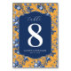 This wedding table card features a vibrant design with a navy blue central rectangle set against an orange background adorned with intricate blue and white floral patterns. The elegant layout includes a large, stylish number "8" in the center, surrounded by clean, well-spaced typography that adds to its sophisticated charm. The combination of classic floral motifs and modern simplicity creates a formal yet inviting atmosphere, perfect for celebrating special moments like weddings.