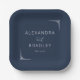 This elegant wedding plate features a minimalist design with a deep navy blue background, creating a sophisticated and modern look. The layout includes clean lines and geometric accents in an Art Deco style, enhancing the formal atmosphere. White text is arranged vertically, showcasing two names connected by a cursive "and," while smaller lettering displays the date below. The monochromatic color palette emphasizes clarity and focus, making it perfect for celebrating your special day with understated luxury.