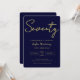 Celebrate a special milestone with this elegant navy and gold 70th birthday invitation. Featuring a bold modern script reading “Seventy” and refined gold accents, this design adds a luxurious touch to any birthday celebration. Perfect for formal gatherings, family parties, or upscale events. Easily customize the name, date, time, and venue to match your occasion. A stylish and sophisticated choice for honoring a remarkable 70th birthday.