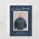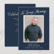 This elegant memorial photo card *and* Celebration of Life invitation features a dark blue background, a single vertical photo, and simple yet elegant typography in white. One the back, the dark blue background is repeated with text for an invitation to a celebration of life. You can remove the text on the back if desired, just click on "edit with design tool".
