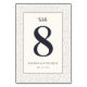 This elegant wedding table card features a minimalist design with a large, bold number "8" at the center, surrounded by ample negative space. The color palette includes dark navy text on an off-white background, creating a sophisticated contrast. A dotted border frames the composition neatly, adding texture without overwhelming the simplicity of the layout. Customizable placeholders for names and dates allow personalization, making it perfect for special occasions like weddings. The combination of serif and script fonts adds a touch of formality and charm, conveying a mood of understated luxury and clarity.