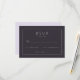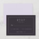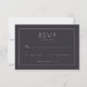 This elegant wedding RSVP card features a minimalist design with a deep navy background and clean, white typography. The layout is centered and balanced, creating a sophisticated look that emphasizes clarity and formality. With options for guests to "Happily Accept" or "Regretfully Decline," the card includes customizable fields for personalization, making it both functional and stylish. Its modern aesthetic and understated elegance make it perfect for formal events, conveying a mood of refinement and anticipation.