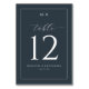 This elegant wedding table card features a deep navy blue background with crisp white text, creating a sophisticated and modern look. The design includes a minimalist header with initials "M" and "K," followed by the word "table" in an elegant cursive script. Dominating the center is the large number "12" in bold serif typography, making it easy to identify seating arrangements. The clean sans-serif font for names adds a contemporary touch, while ample negative space ensures clarity and focus on the essential details. Perfect for formal events, this card exudes elegance and simplicity, ideal for creating a refined atmosphere at your wedding reception.
