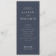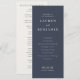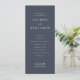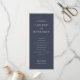 This elegant wedding program features a deep navy blue background with crisp white text, creating a sophisticated and formal aesthetic. The layout is clean and minimalist, with the names prominently displayed in bold serif fonts, complemented by a cursive "and" for a touch of whimsy. The structured hierarchy guides guests through the ceremony events, while the footer provides essential details in a modern sans-serif font. Perfect for couples seeking a classic yet contemporary look, this design exudes elegance and anticipation for the special day.