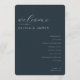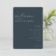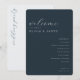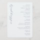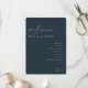 This elegant wedding program features a deep navy blue background with a minimalist layout that exudes sophistication. The design includes a mix of flowing script and clean serif fonts, creating a clear hierarchy and focal point for the couple's names. A simple sans-serif font lists the ceremony schedule in an organized manner, enhancing readability. The overall style is formal and serene, perfect for a sophisticated wedding celebration.