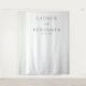 This wedding backdrop features a minimalist design with a clean, elegant aesthetic. The layout is vertically oriented, showcasing a soft, neutral color palette of light beige or off-white background complemented by muted gray tones for text and decorative elements. Vertical striped patterns on the left add subtle texture, while centered typography in uppercase serif fonts highlights the names and date, creating a balanced and sophisticated look. The ample negative space enhances simplicity, making it perfect for a modern, understated celebration.