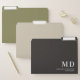 A set of modern minimalist file folders in neutral shades of green, beige and black. Personalize with your monogram and business name.