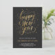 Elegant New Year's Eve invitation with gold script saying "Happy New Year" on a black background, with event details in gold beneath.