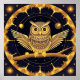 Stylized illustration of a night owl perched on a branch surrounded by gold and blue patterns, evoking a magical and mystical ambiance, ideal for decorative or artistic purposes.