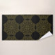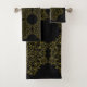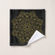 This elegant bath towel set features a repeating pattern of old gold mandalas on a black background.