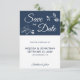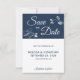 Elegant and romantic Save The Date card featuring a beautiful and delicate white orchids line drawing design at the top, over a classy Prussian blue background. The lower part is easily personalizable by editing the template fields with your names, date, and location in a modern and simple dark blue all-caps font over a simple white background.